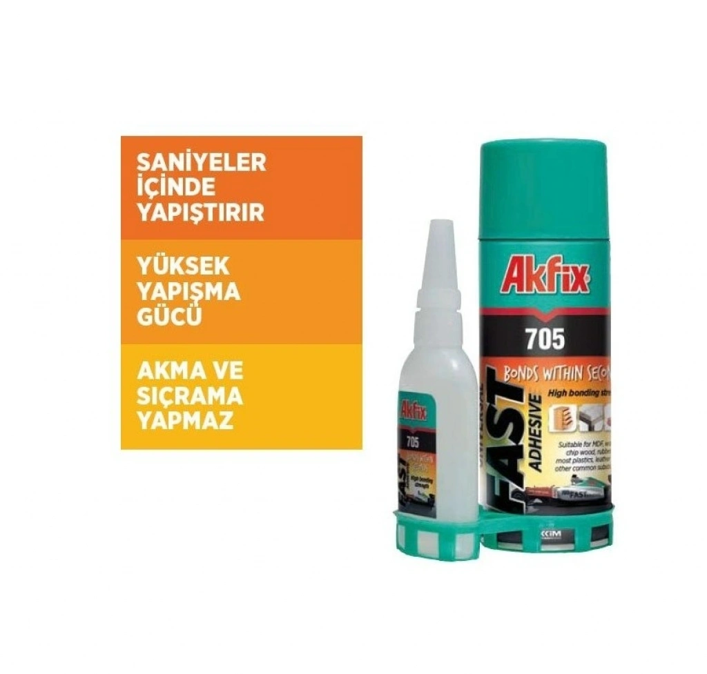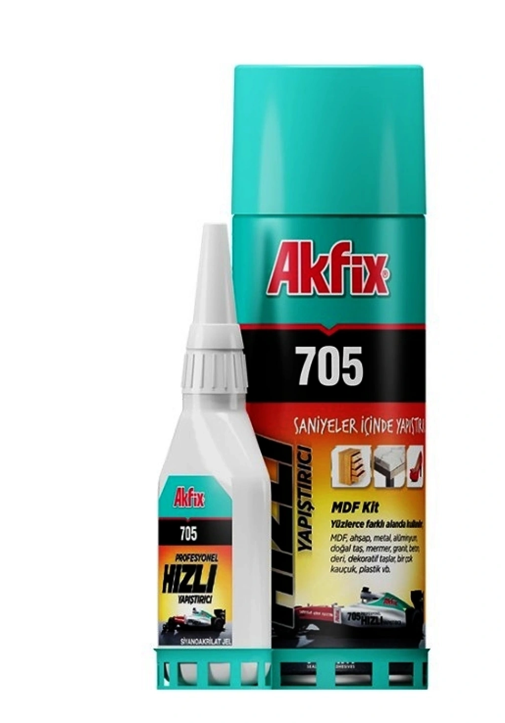 Günlük yaşamda çok geniş bir kullanım alanına sahip olan Akfix 705 Hızlı Yapıştırıcı (Mdf Kit) bir adet siyanoakrilat ve bir adet aktivatörden oluşan bir settir.