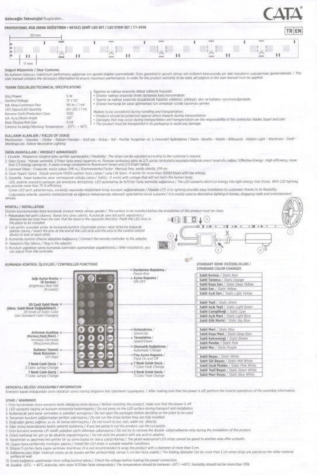 CATA RGB Şerit Led Seti, enerji verimliliği sağlayan 220V giriş adaptörü 12V gücüyle uzun ömürlüdür ve şık tasarımıyla yaşam alanlarınıza modern bir dokunuş katar. Farklı renk seçenekleri ile istediğiniz ortamı yaratabilir ve dekorasyonunuzu kişiselleştirebilirsiniz. Ev, ofis, cafe gibi birçok mekanda kullanabileceğiniz bu ürün, mekanınıza sıcak ve davetkar bir atmosfer kazandırmak için ideal bir seçenektir.