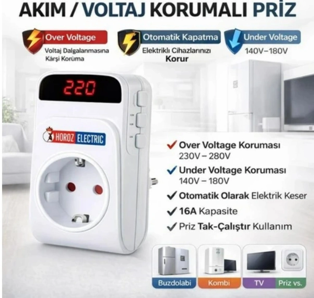 Yüksek/Düşük Voltaj Koruması: Şebeke elektriği güvenli sınırların dışına çıktığında enerjiyi keser.