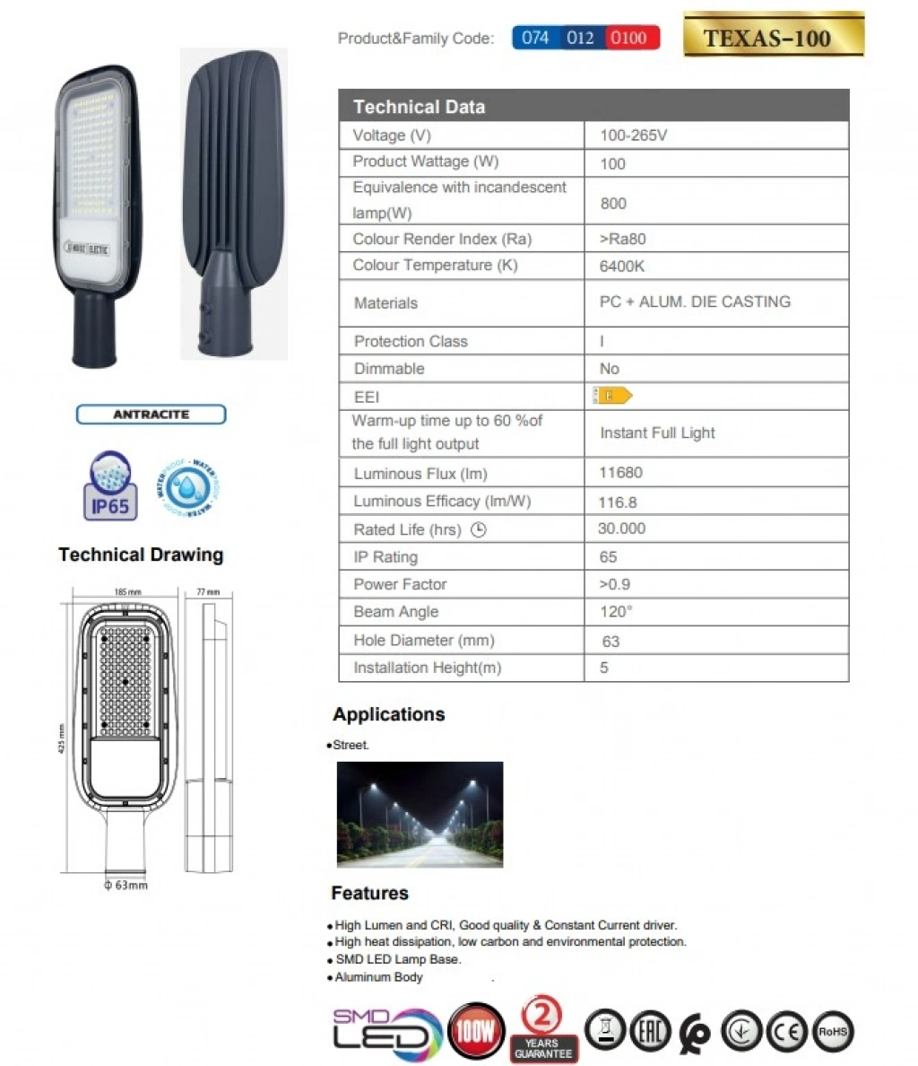 HOROZ Texas-100 100w Ledli Sokak Lambası Armatürü, şehir aydınlatmaları ve sokak aydınlatmaları için mükemmel bir seçenektir. 6400K beyaz ışık rengiyle çevreyi aydınlatır ve 220 Volt enerjiyle çalışır. Dayanıklı IP65 koruma sınıfı sayesinde dış mekan koşullarına karşı koruma sağlar. Horoz markasının güvenilirliği ile tasarlanan bu armatür, yüksek performansıyla öne çıkar. Hem çevre dostu hem de enerji verimli olan Texas-100W, şehrinize modern bir görünüm kazandıracak.