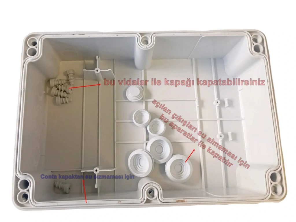 Abs Plastik vidalar mevcuttur üçtane bunlar ile ürünün kapağını kapatabilirsiniz. Ürünün içerisinde su geçmemesi için lastik conta mevcuttur bu conta ile ürünü kapak arasındaki su sızıntılarını önleyebilirsiniz.