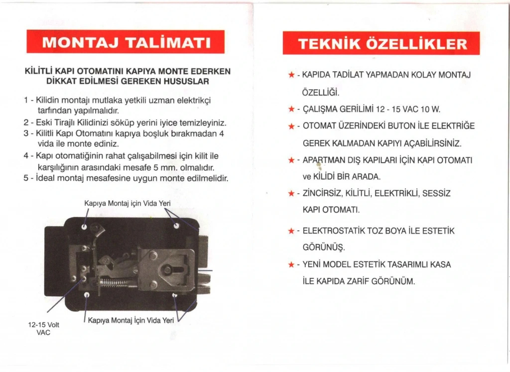 Kilidin montajı mutlaka yetkili uzman elektrikçi tarafından yapılmalıdır.