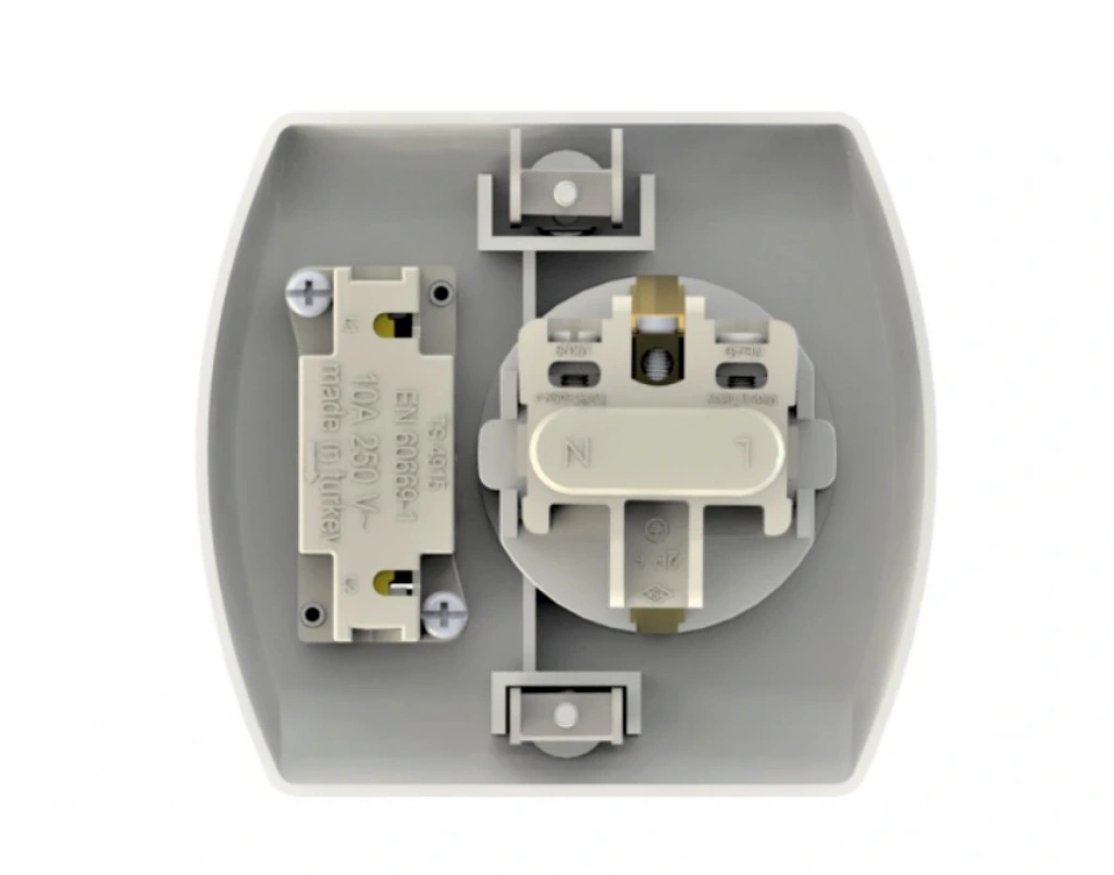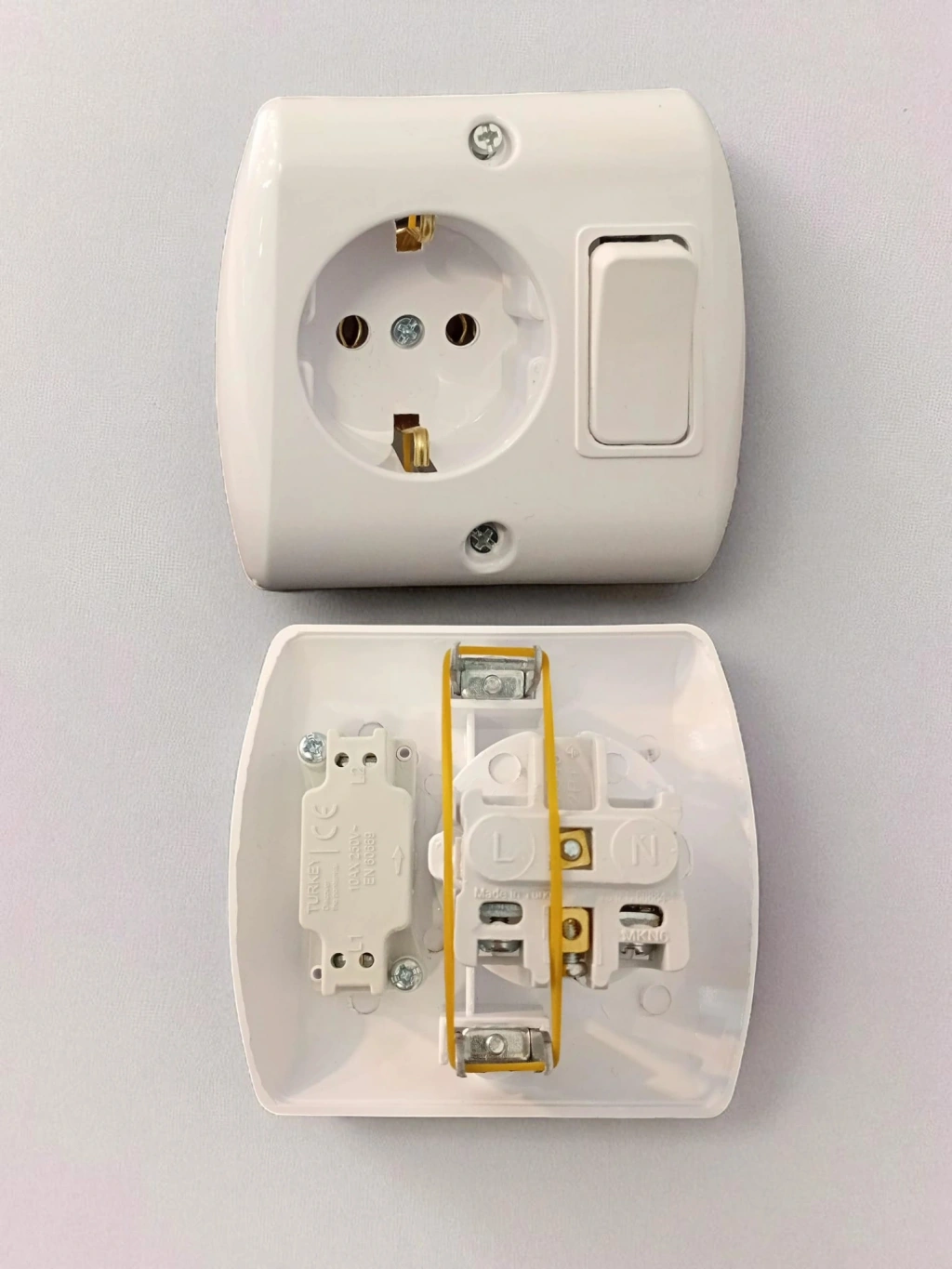 Tek yuvaya girişli hem priz hemde anahtarlı Banyo mutfak gibi basit elektrikli ev aletlerini takıp kullanmak ve aydınlatmaları açıp kapatmak için hemen her yerde kullanılabilir.