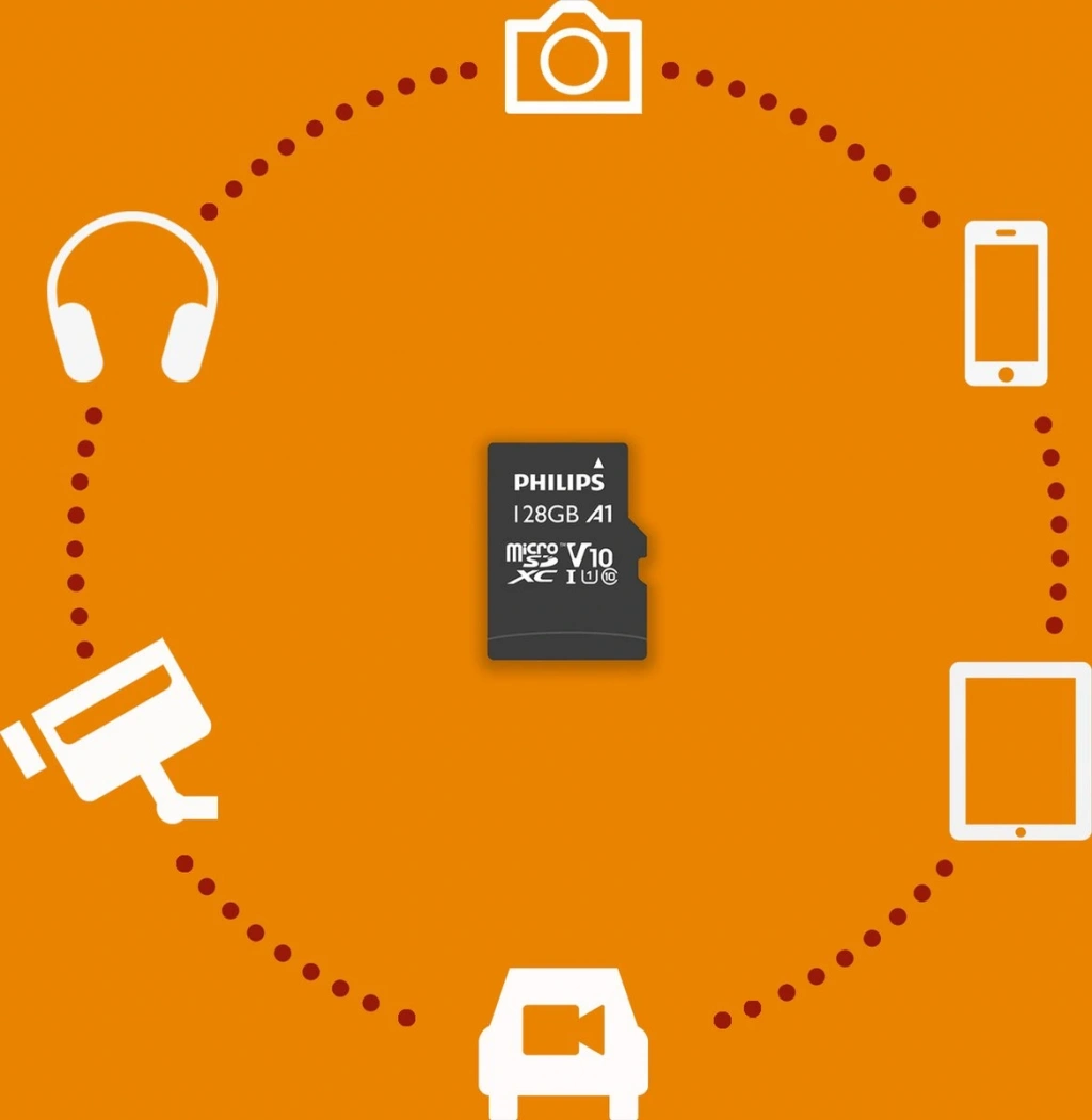 Philips Micro SDXC Sınıf 10 UHS-I U1 hafıza kartları, (Tam) HD video kaydı gibi yüksek yazma hızlarının önemli olduğu uygulamalar için oldukça uygundur.