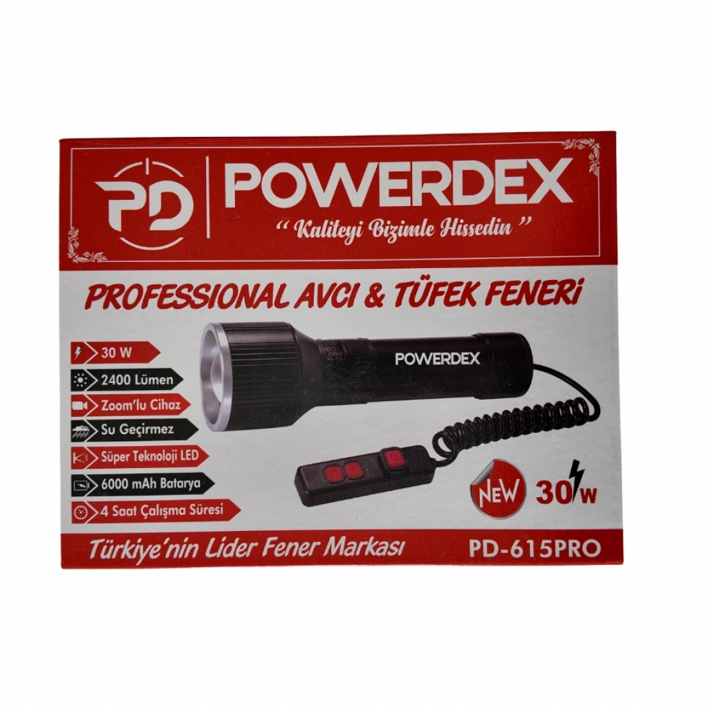 30 watt gücünde LED ışık kaynağı.POWERDEX 30w Şarjlı Ledli Profesyonel Avcı Tüfek El Feneri, nokta atışı aydınlatma sağlayarak avcılık deneyiminizi mükemmelleştirir. Gece avcılığı yaparken güvenle kullanabileceğiniz bu ürün sayesinde her detayı net bir şekilde görebilirsiniz. Av sahalarında kendinizi daha emniyette hissetmek ve başarılı avlar yapmak için Powerdex'i tercih edebilirsiniz. ?