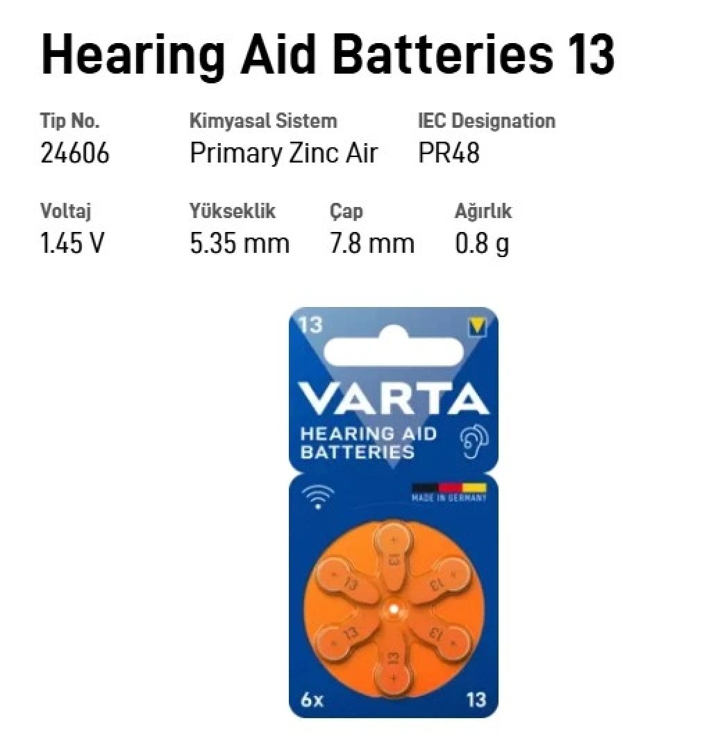 Kulak İşitme Cihazı Pili NO:13 1 Paket (İçerisinde 6 Adet mevcuttur) Tüm 13 Numaraya Uygun Cihazlarda Kullanılır