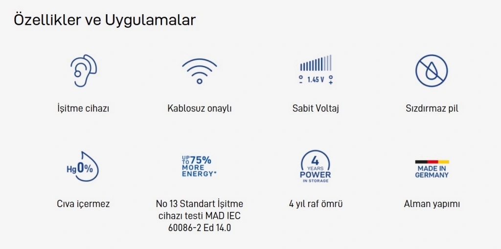 * Standart işitme cihazı testi MAD.IEC 60086-2 Ed14.0 'e göre %75'e kadar daha fazla enerji.Performans kullanıma göre değişiklik gösterebilir.